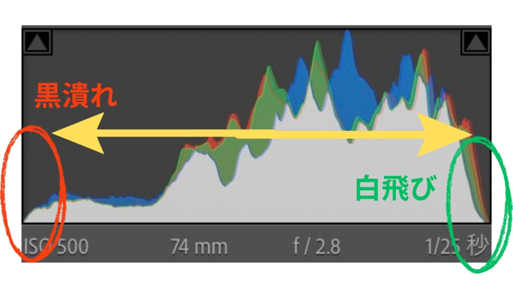ヒストグラムは白いグラフが左端にくっつくと、黒潰れになります。