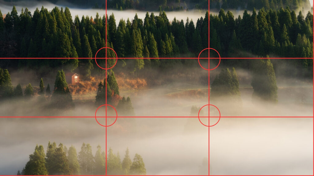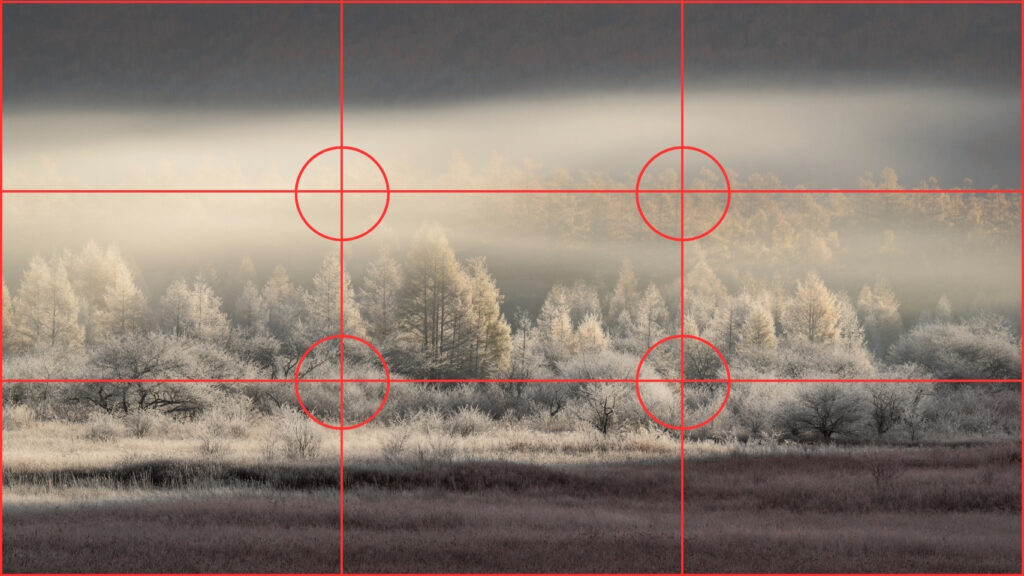 グリッド線が交わるところ(赤丸)に、木を配置することで写真全体にまとまりが出ています。