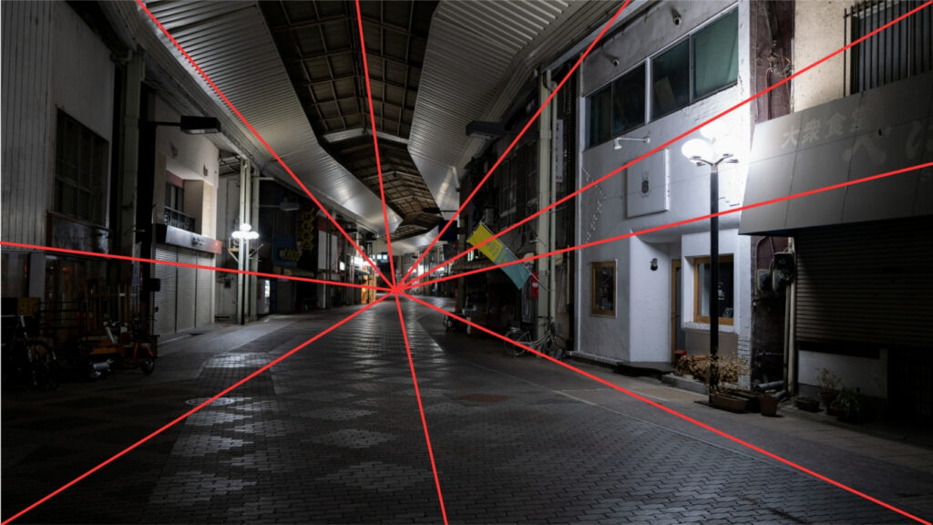 画面上の特定の1点から複数の線が放射状に広がる1点に向かって収束するように配置された構図です。